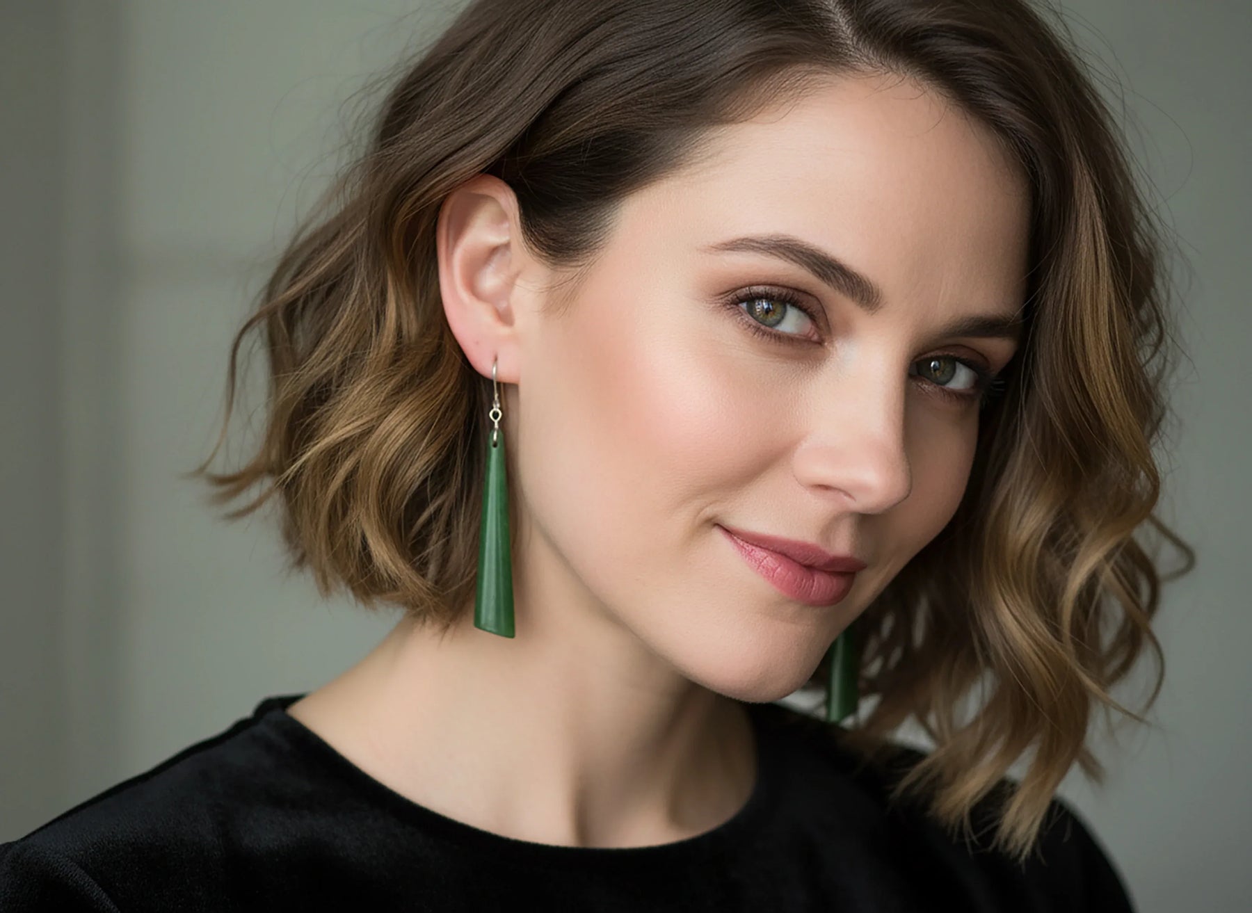 Large natural nephrite green jade smooth teardrop earrings. The French earwires are 14k gold or 14k yellow or rose gold filled or sterling silver - you choose the finish. The gemstone size is 9x50mm, over 30 carats. A unique and hard to find angled bottom cut, lightweight and easy to wear for a large earring. The mannequin shows the relative size and how they will hang. Earrings hang 2.7 inches.