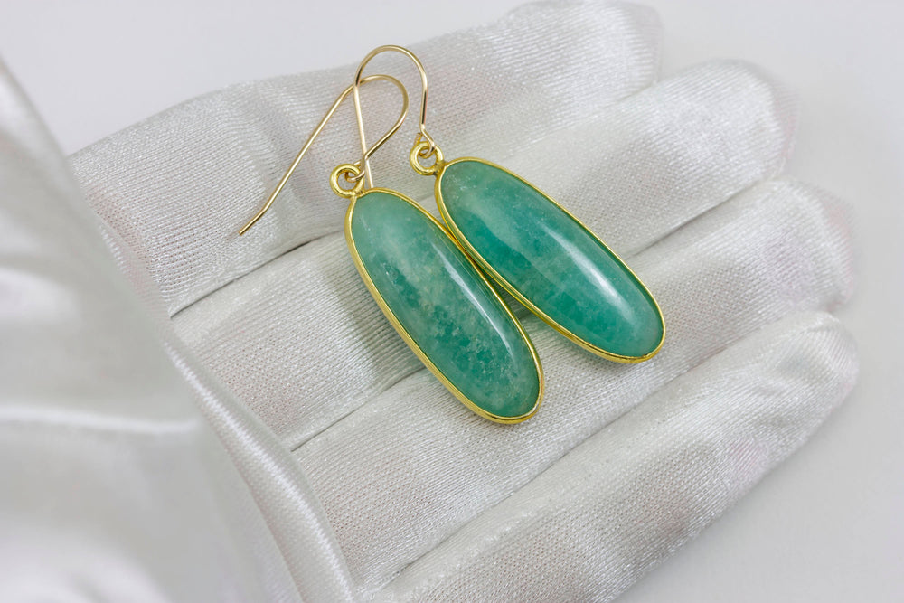 Amazonite Earrings Blue Green Smooth Long Oval Bezel Set 14k Solid Gold or Filled Natural Earthy Simple Casual Wear Spyglass Designs