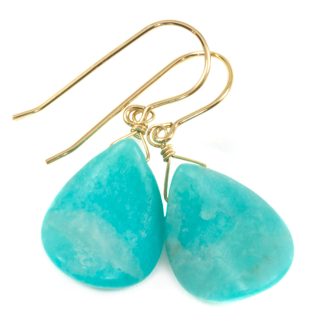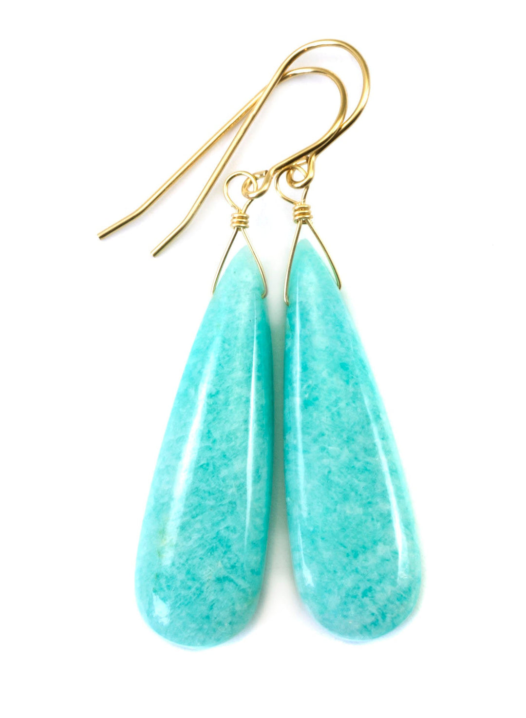 Amazonite Earrings Blue Aqua Smooth Finish Long Teardrop Briolette Sterling Silver or 14k Solid Gold or Filled Pale Soft Blue 2 Inch