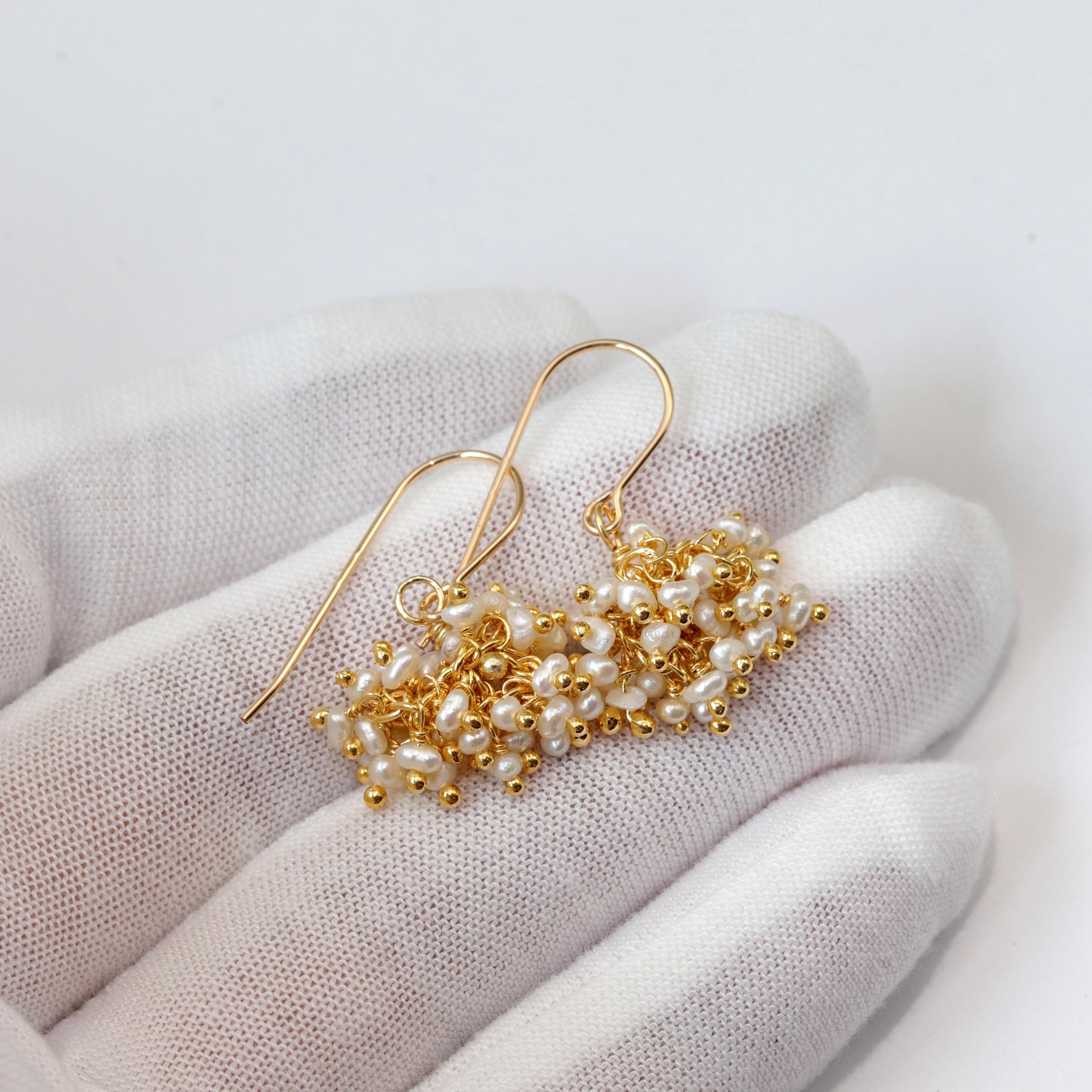White natural freshwater cultured tiny seed pearls. Lots of them on each earring. A great wardrobe "go to" earring. 14k solid gold or 14k gold filled or sterling silver french earwires - you choose. Earrings hang 1 inch. True tiny seed pearls less than 1- 2mm in size. Very versatile earrings, work with lots of outfits, nice movement while wearing. Goldtone or silvertone pearl wiring.  The mannequin shows the relative size and how they will hang. Shipping is Free!