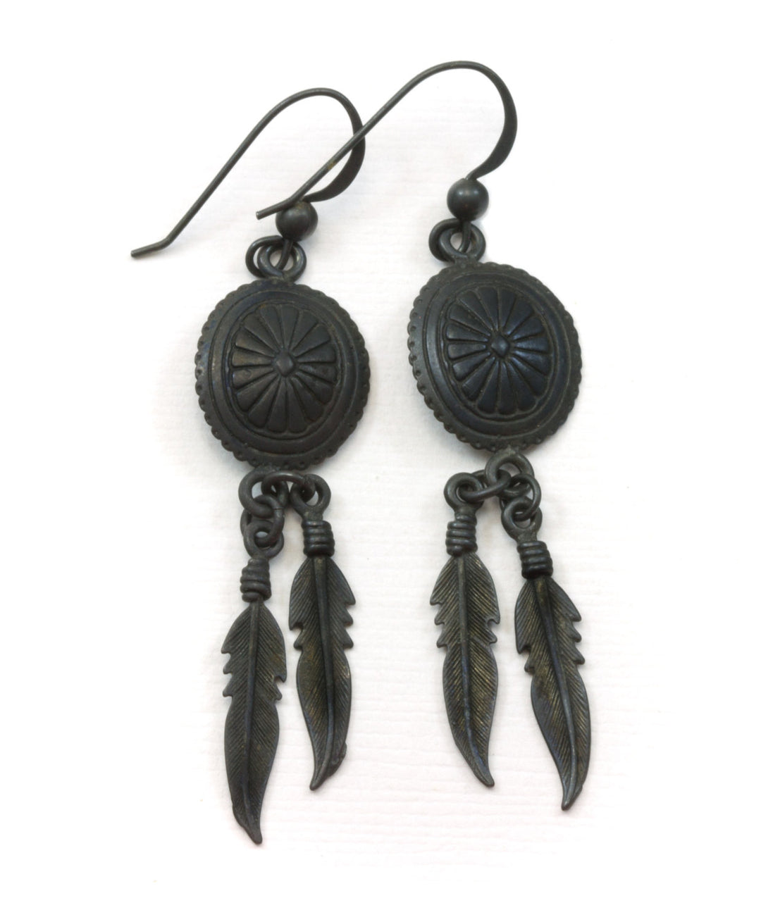 Black Oxidized Sterling Silver Earrings Indian Design Dangle Feathers Patterned Oval Long Lightweight Dangles