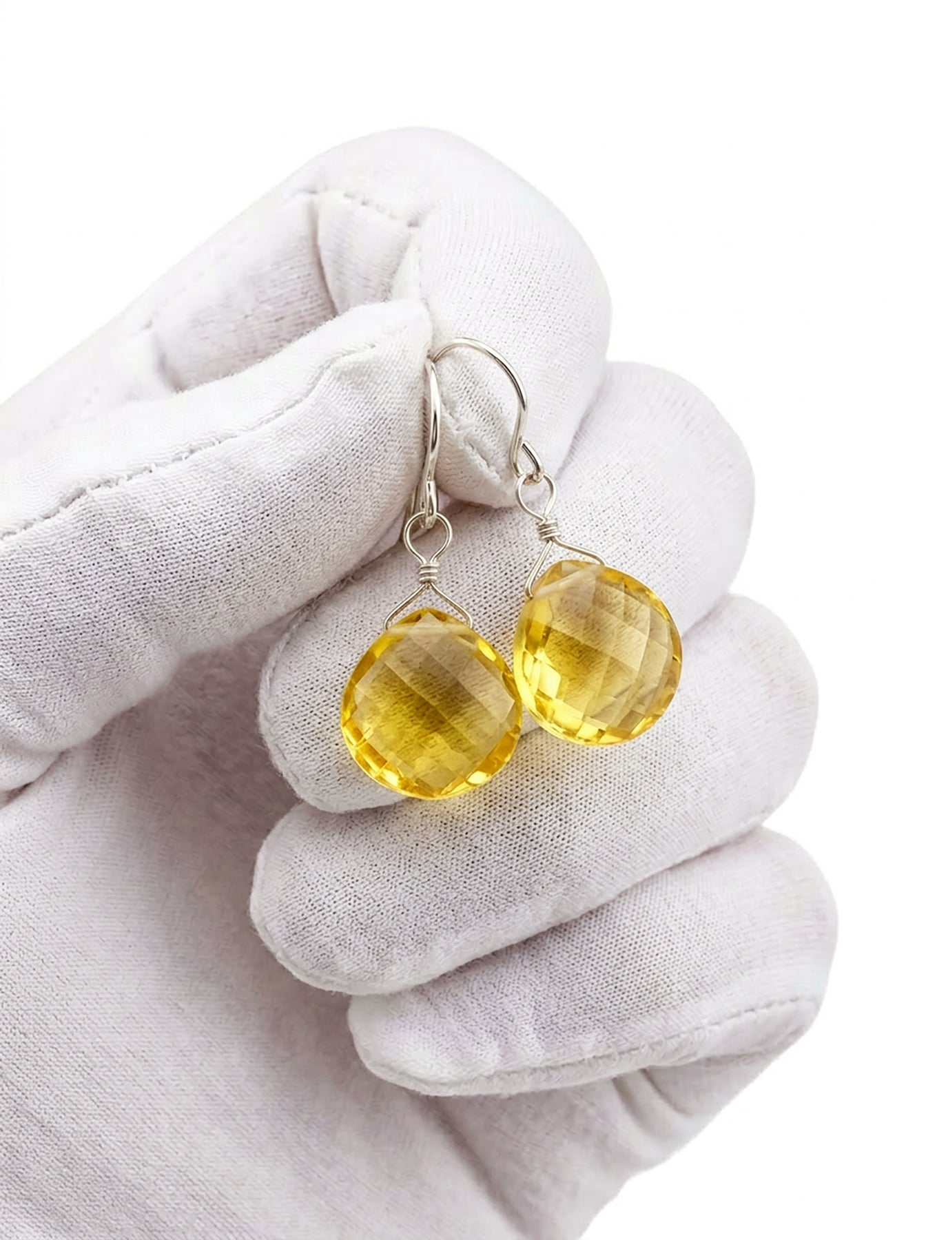 A lite earthy shade of simulated citrine in a yellow faceted quartz in a heart drop. The French ear wires are 14k solid gold or 14k yellow or rose gold filled or sterling silver - you choose the finish. The gemstone size is 12mm, over 10 carats. The model shows the relative size and how they will hang. Earrings hang 1.1 inches.