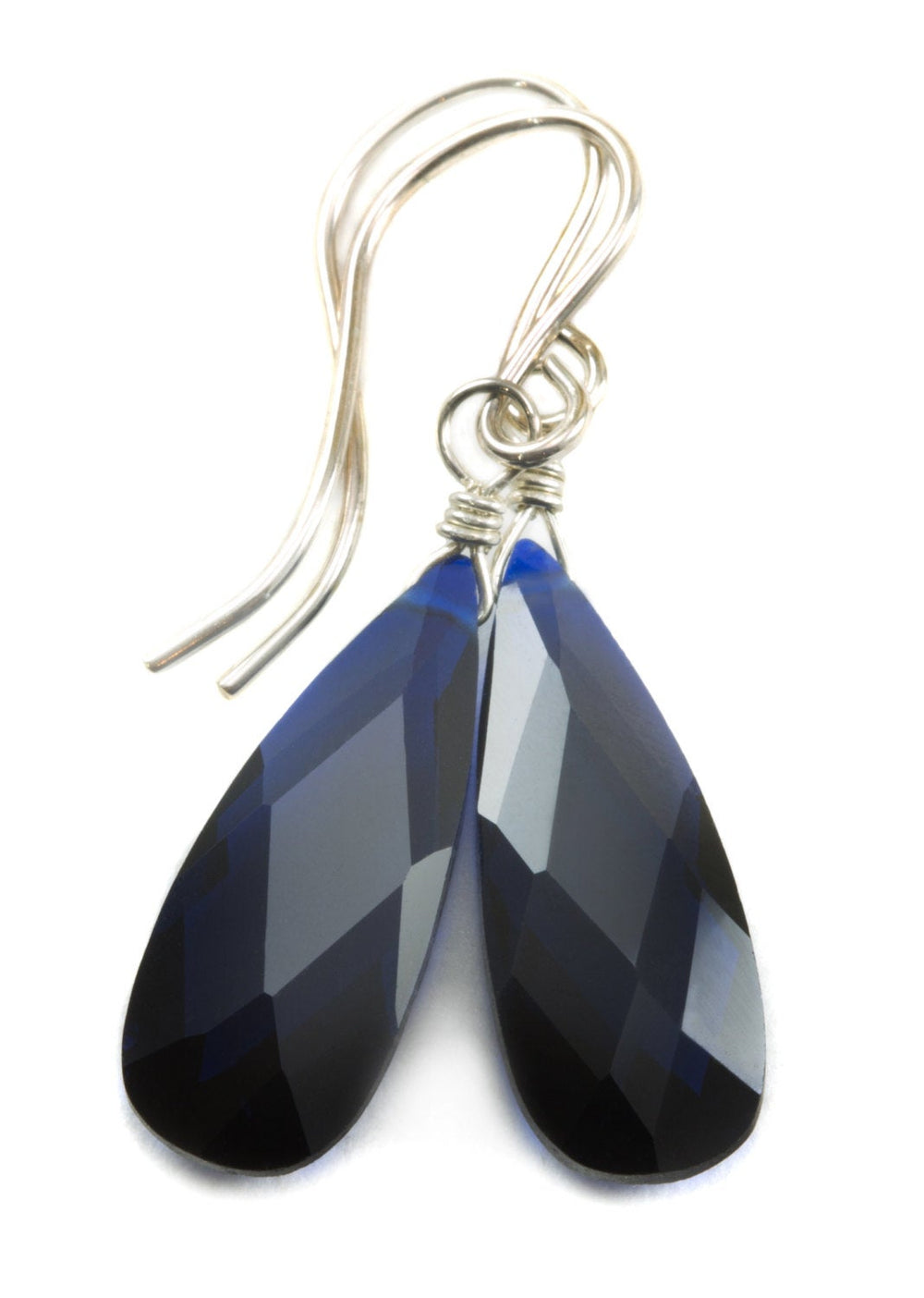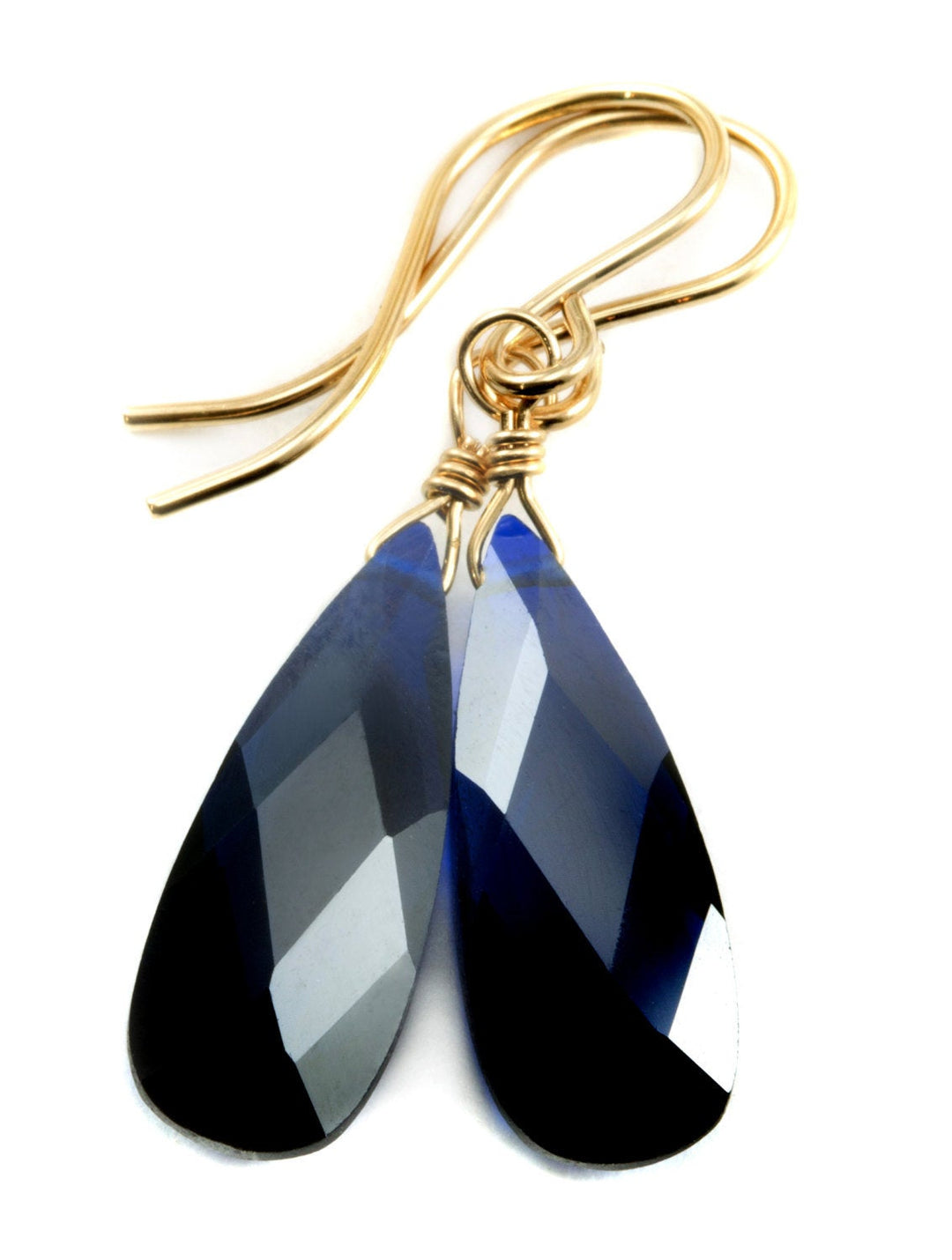 Dark Blue Sapphire Cubic Zirconia Earrings Long Faceted Teardrop Briolette AAA CZ Sterling Silver or 14k Solid Gold or Filled Simple drops