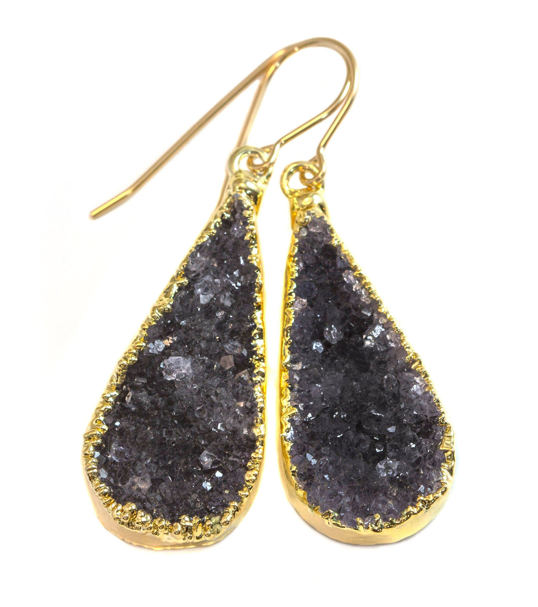 Drusy Earrings Black Gray Long Large Druzy Teardrop 14k Solid Gold or Filled or Sterling Silver Electroplated Natural Quartz Earthy Drops