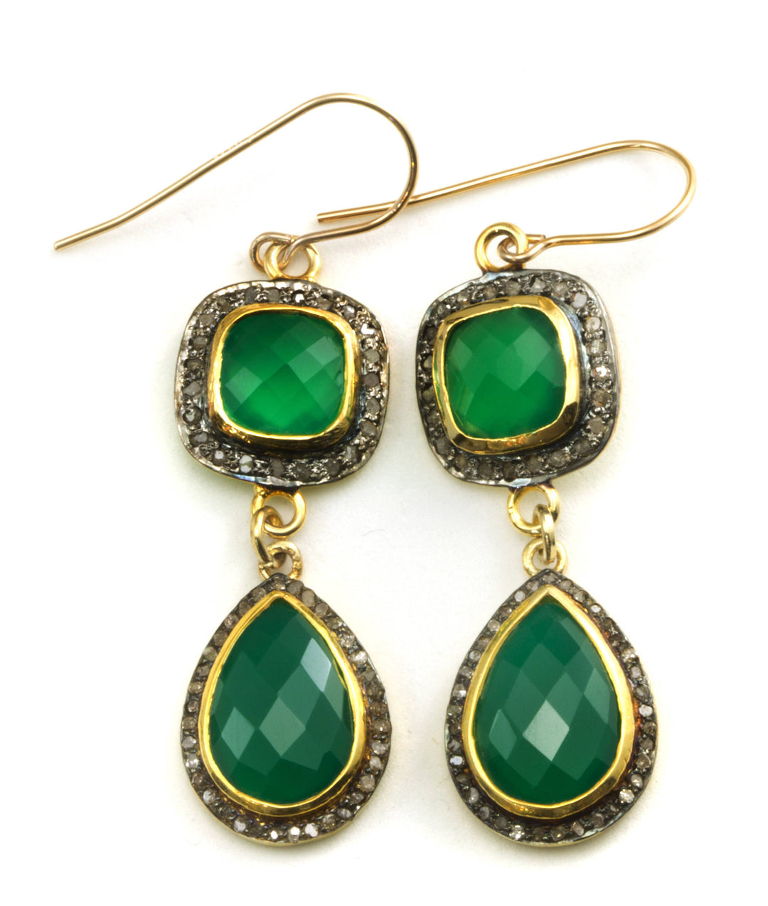 Green Onyx Earrings Double Hung Natural Pave Champagne Diamonds 14k Yellow Gold black Rhodium Plate 2 Inch Drops Round or Square Top Post