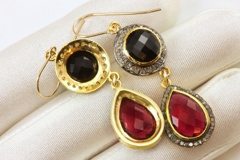 Pink Sim Sapphire Black Onyx Earrings Double Hung Natural Pave Champagne Diamonds 14k Yellow Gold and black Rhodium Plate 2 Inch Drops