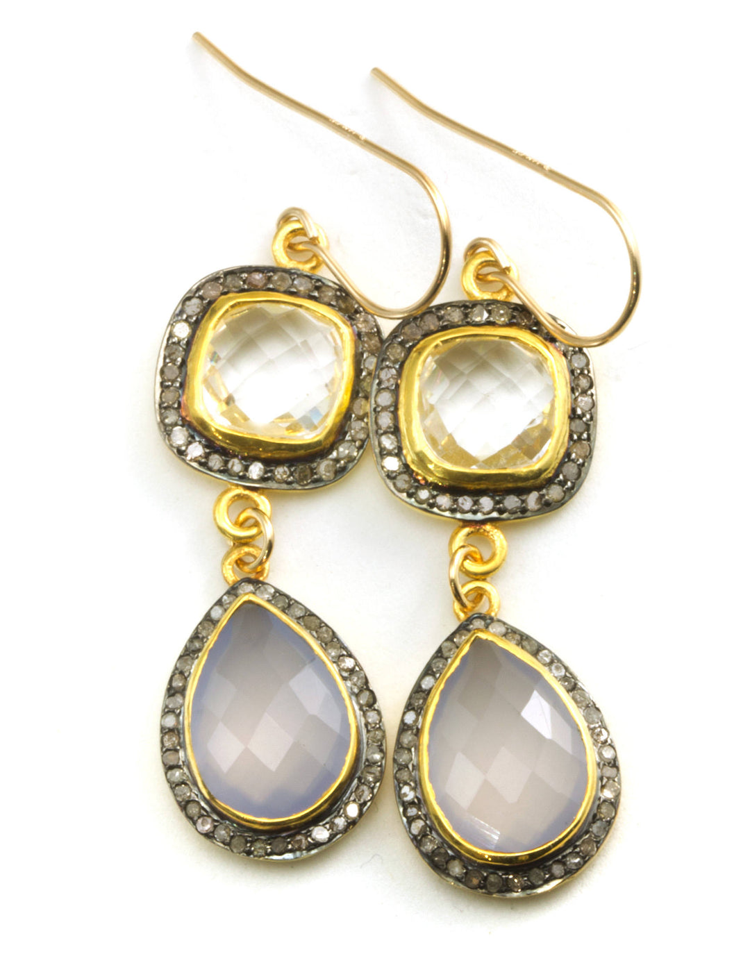 Pink Chalcedony Earrings Double Hung Natural Pave Champagne Diamonds 14k Solid Yellow Gold and black Rhodium Plate Clear Quartz 2 Inch Drop