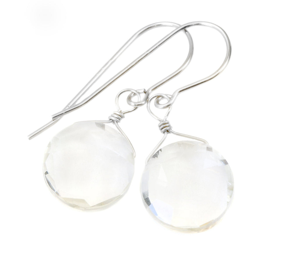 Topaz Earrings Round Briolette Teardrop Dangle faceted Sterling Silver or 14k Solid Gold Filled Clear Colorless Simple Drops Spyglass Design