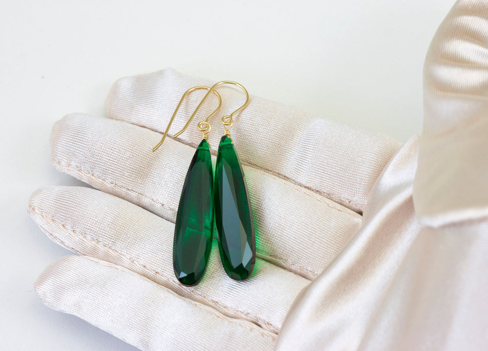 Emerald Green Earrings Faceted Long Simulated Emerald Teardrop Drop Dangle Sterling Silver or 14k Solid Gold or Filled Simple Classic 1.6 In