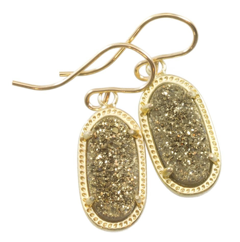 Sparkly Golden narrow oval shaped drusy bezel set earrings. Great sparkle hard to see in photos. 14k solid gold or 14k gold filled french earwires - you choose. Stones are 7x13mm. A super - go to earring either casual or dressy. Earrings hang 1.1 inches, small and dainty. Fancy bezel surround. The mannequin shows the relative size and how they will hang. Really nice high quality drusy.