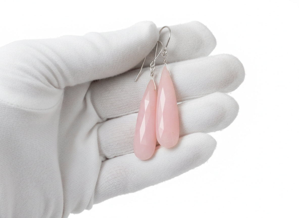 Soft Pink Peruvian Opal earrings. Faceted cut teardrop. High quality French ear wires - either 14k solid yellow gold or 14k gold filled or sterling silver available - you choose. Gemstone size is 10x40mm, 25 carats. Earrings hang 2.2 inches. Opals are naturally lightweight to wear for larger earrings.