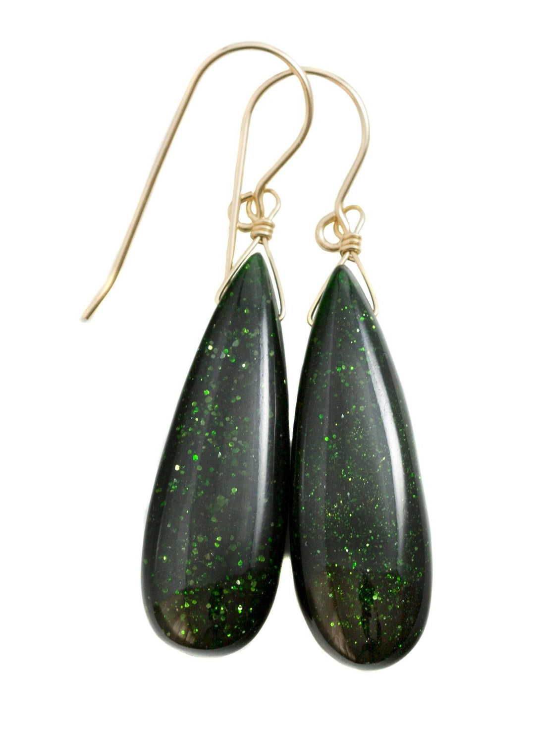 Goldstone Earrings Green Sparkly long smooth Teardrops dangle drops Sterling Silver or 14k Solid Yellow Gold or filled Spyglass Designs