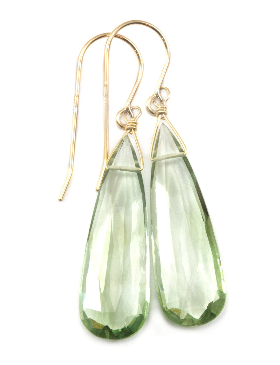 Green Amethyst Earrings Prasiolite Faceted Long Pear Teardrop 14k Solid Gold or Filled or Sterling Silver Simply Daily Pale Soft Green Drop