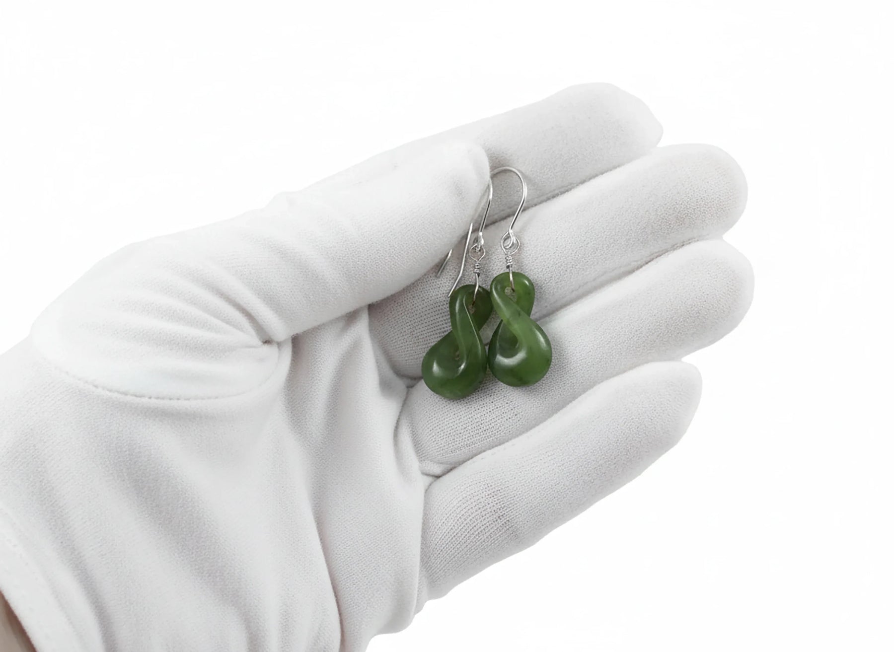 Natural nephrite green jade smooth hand carved infinity teardrop earrings. The French ear wires are 14k solid gold or 14k yellow or rose gold filled or sterling silver - you choose the finish. The gemstone size is 10x18mm, 10 carats. A unique and hard to find cut. The mannequin shows the relative size and how they will hang. Earrings hang 1.3 inches.