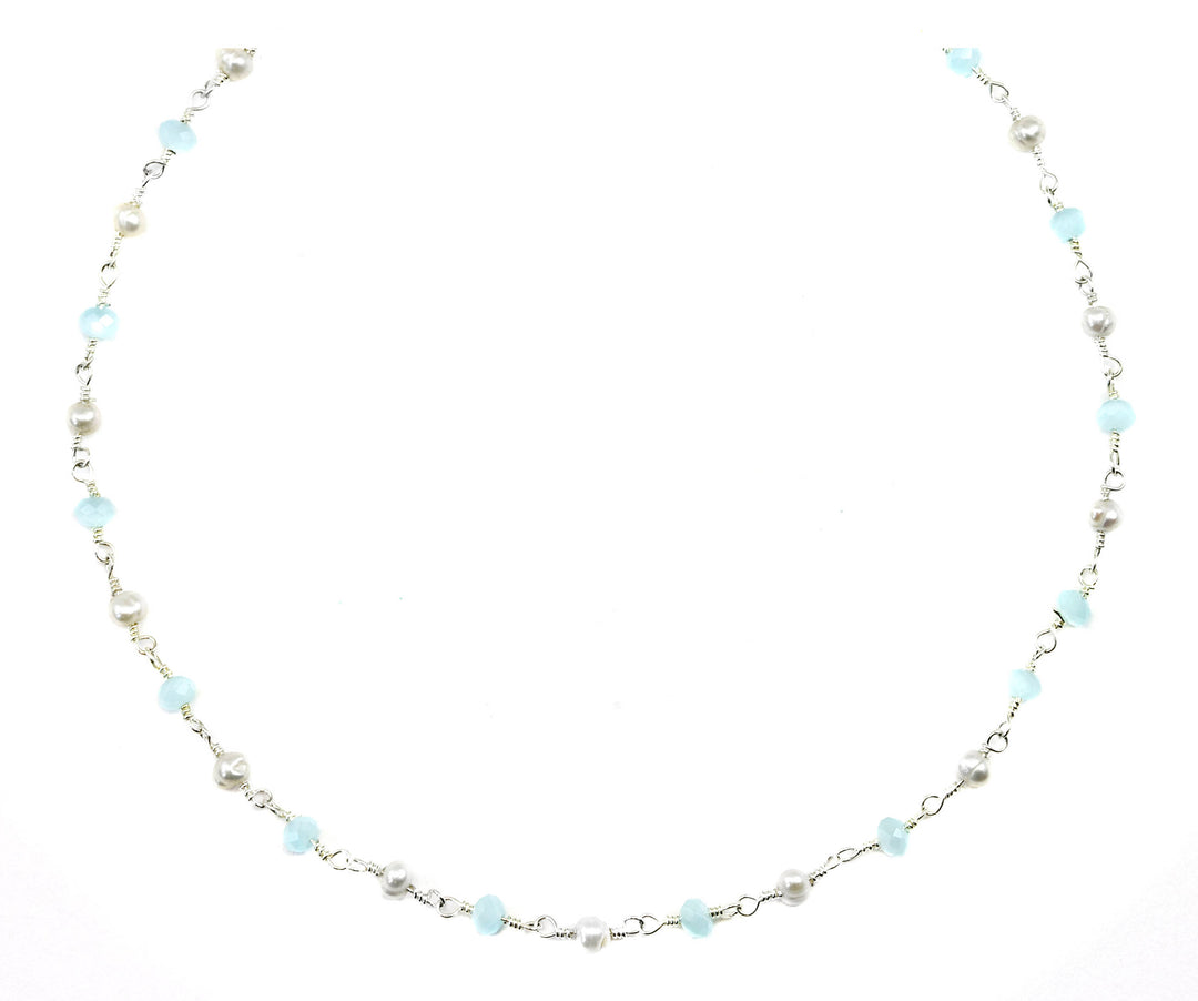 Chalcedony Necklace Soft Blue and White Pearl Sterling Silver or 14k Gold Filled Faceted Chain Link 18 19 Inches Soft Pale Baby Blue Dainty