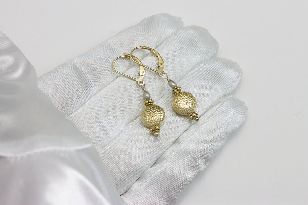 14k Gold Filled hammered button Earrings Brushed Gold Bright Yellow vemeil Tiny Pearls contemporary Leverback handmade Spyglass Designs