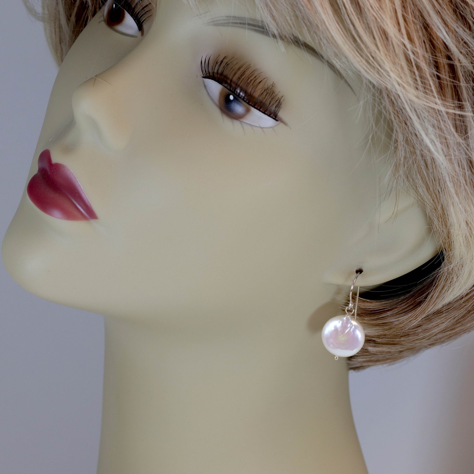 Silvery white natural button cultured freshwater pearls. These are puffed button pearls 5mm thick and 14mm round. A great wardrobe "go to" earring. Sterling silver, 14k yellow gold or 14k yellow or rose gold filled French ear wires - you choose. Earrings hang 1.2 inches simple great everyday earrings. The mannequin shows the relative size and how they will hang. Shipping is Free!
