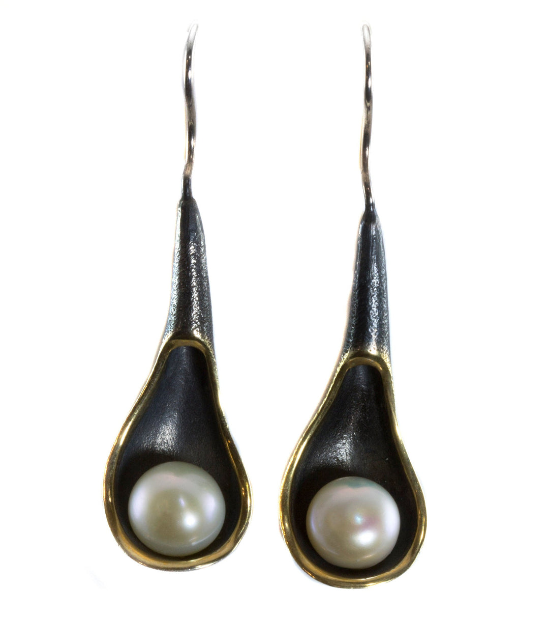 Pearl Earrings 14k solid gold and Oxidized Black Sterling Silver Freshwater Cultured Pearls Bowl Artisan Handmade Design Earthy Fluid Drops