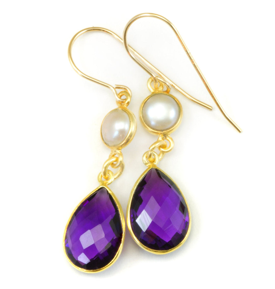 Purple Amethyst Earrings Bezeled Set Double Hung Natural White Freshwater Pearl Smooth Cut 14k Yellow Gold or Filled Long Classic simple