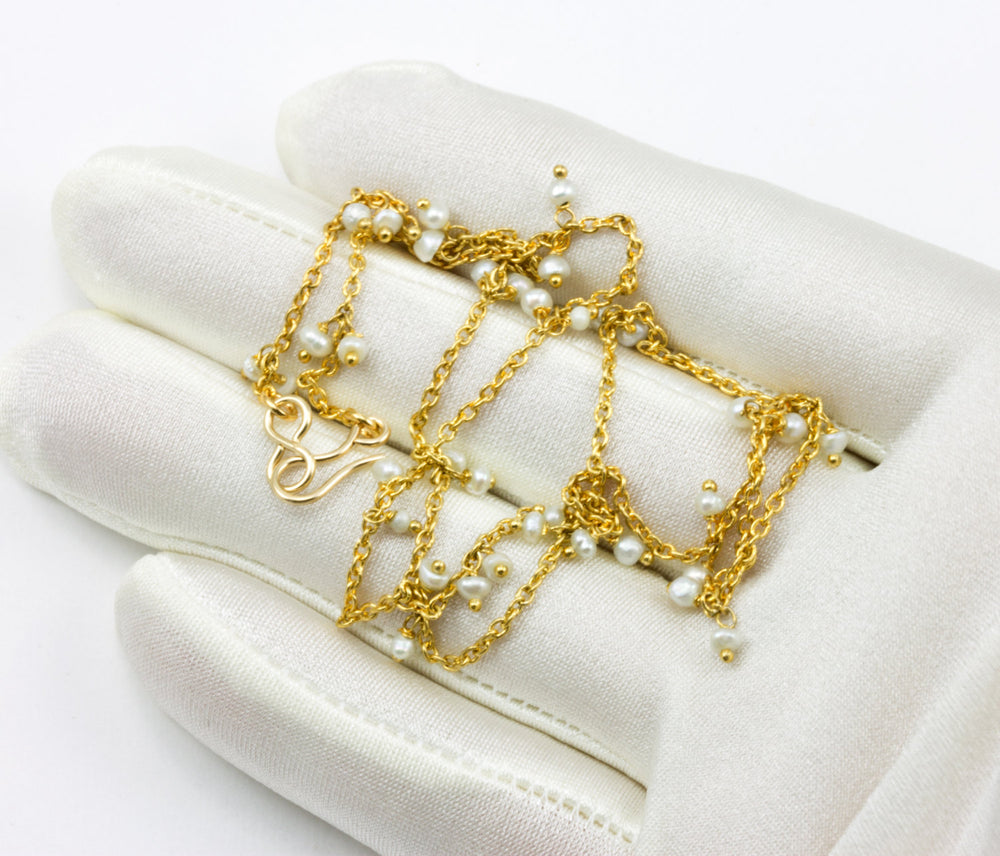 White Pearl Necklace 14k Gold Filled Spaced Double Strand 36 Inch Chain Link Freshwater Cultured Pearls Dainty Delicate Daily Wear