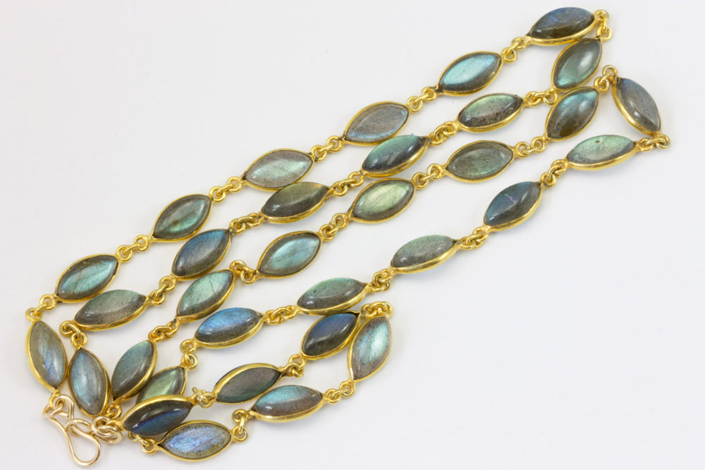 Labradorite Necklace Smooth Bezel Set Marquis Shaped Link Beaded Vermeil 14k Gold Necklace 24 Inch AAA Blue Flash Cut Contemporary Design