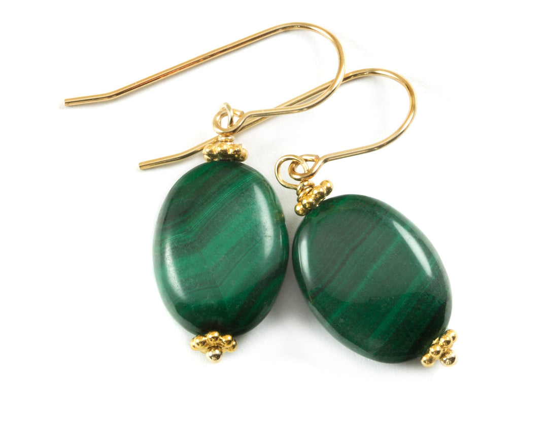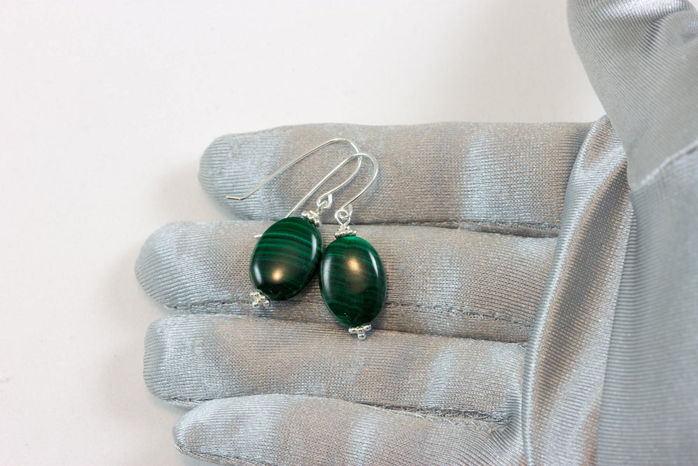 Malachite Earrings Green Oval shaped smooth Natural Dangle Drops Sterling Silver, 14k solid gold or 14k Gold Filled simple design Striped