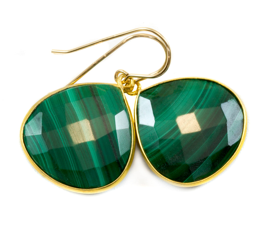 Malachite Earrings Green Heart shaped faceted Natural Dangle Drops 14k Solid Gold or Filled simple bezel Spyglass Designs Classic