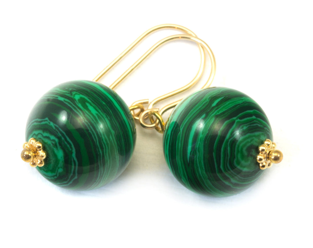 Malachite Earrings Green Round 12mm Dangle Drops Sterling Silver or 14k Solid Gold or Filled Natural Striped Classic Simple Spyglass Designs