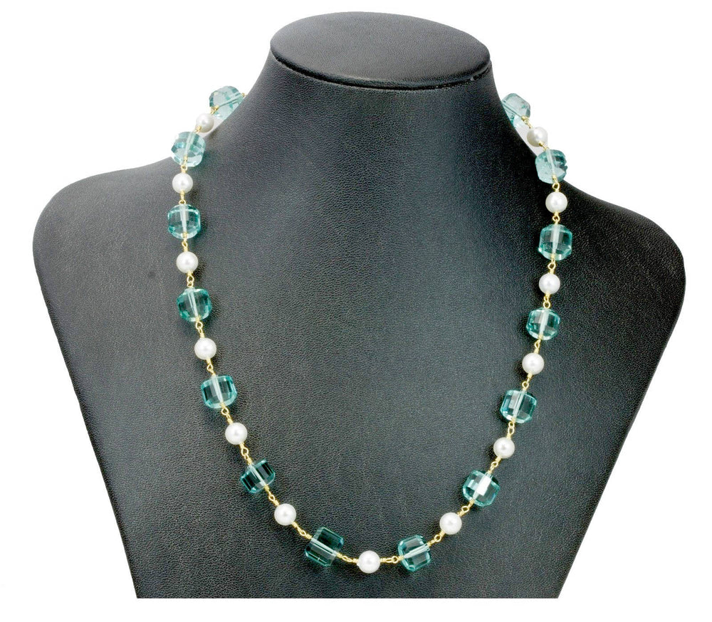 Aquamarine and Pearl Necklace Simulated Stones Faceted Barrel Fancy Cut Beaded 14k Gold Fill and Plate 36 Inches Sparkly and Unique