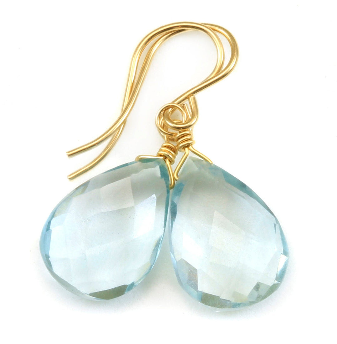 Aquamarine Earrings faceted Simulated Aqua Pear Dangle Drop Teardrop Sterling Silver or 14k Solid Gold or Filled Soft Aqua Blue Simple Daily