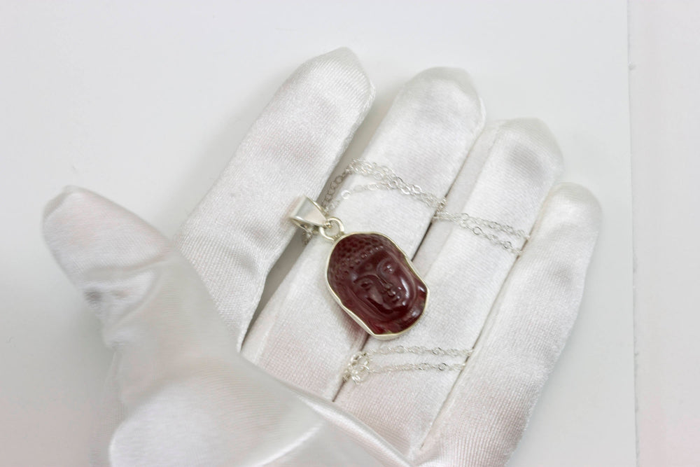 Buddha Pendant Chain Necklace Sterling Silver Simple Small Carved Head Carnelian Agate Stone Bezel Set Simple Everyday Necklace 18 Inches