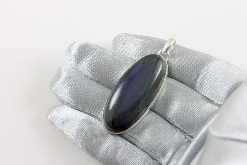 Labradorite Pendant Sterling Silver Long Cabachon Oval Large Necklace Pendent Bezel Set AAA Blue Flash Classic Simple Spyglass Designs