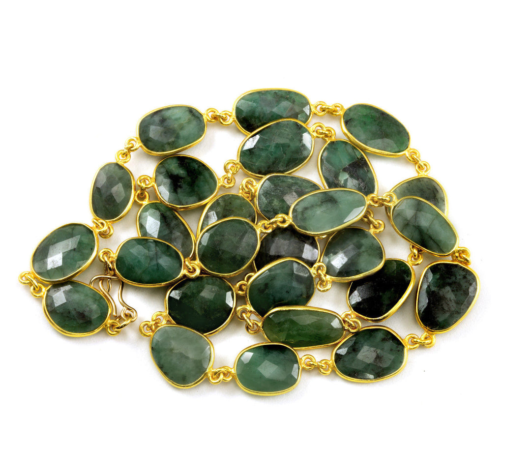 Green Emerald Necklace Bezel Set Stones Off Round Off Oval 24 Inch 14k Gold Filled and Plate Large Faceted Natural African Opaque Stones