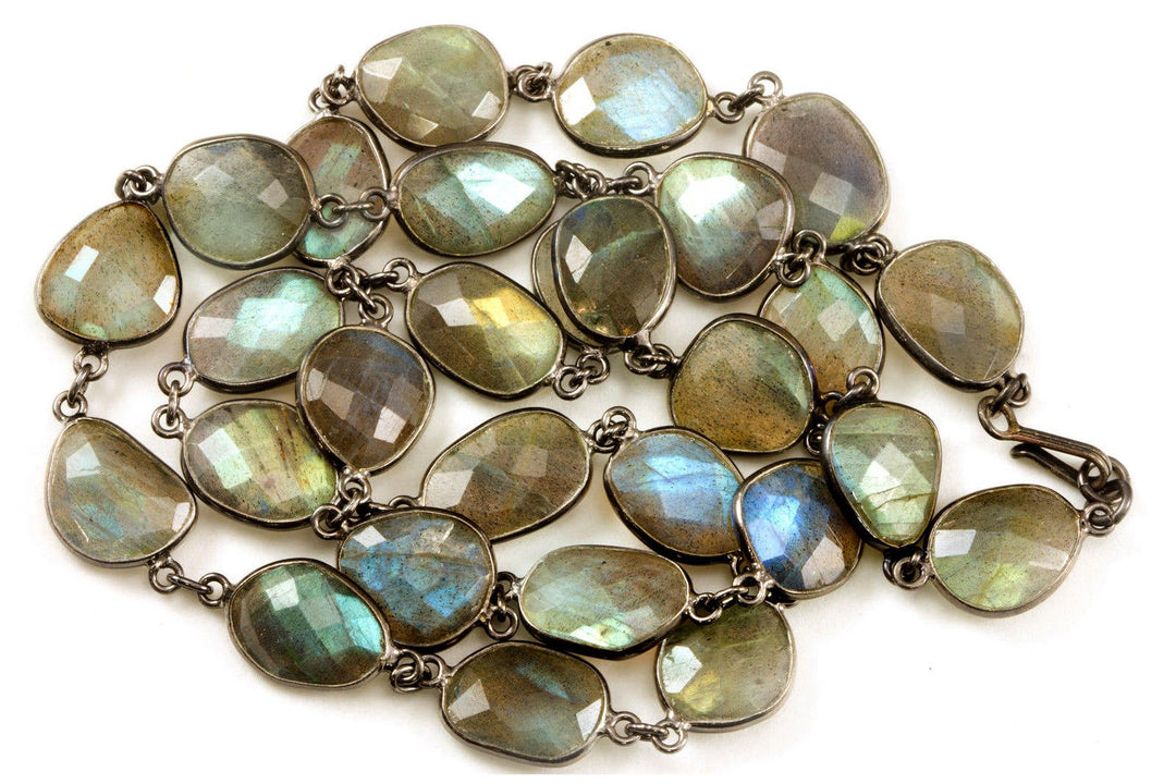 Labradorite Necklace Bezel Set Oval Shaped Faceted Cut Link 14k Gold Plate Necklace 24 Inch AAA Blue Flash Cut Contemporary Design