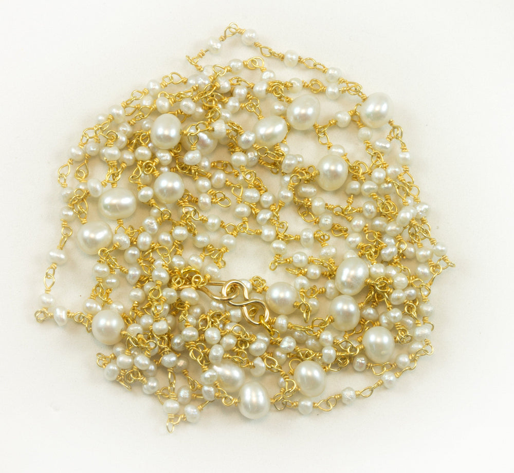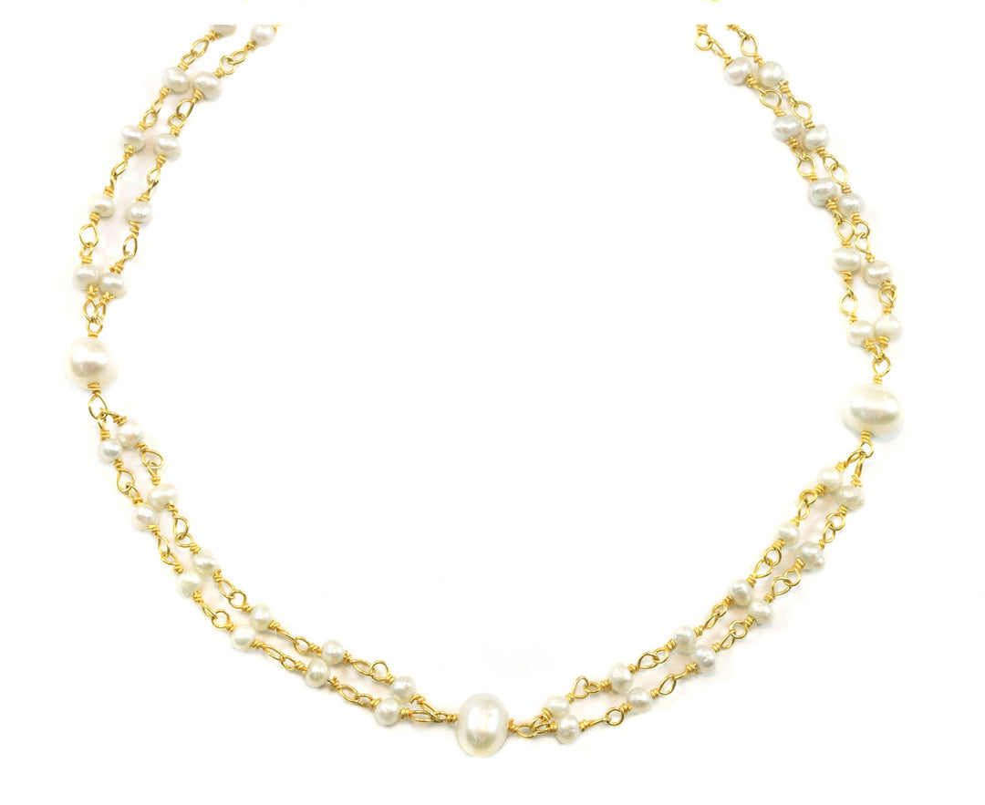 White Pearl Necklace 14k Gold Filled Spaced Double Strand 36 Inch Chain Link Freshwater Cultured Pearls Dainty Delicate Daily Wear