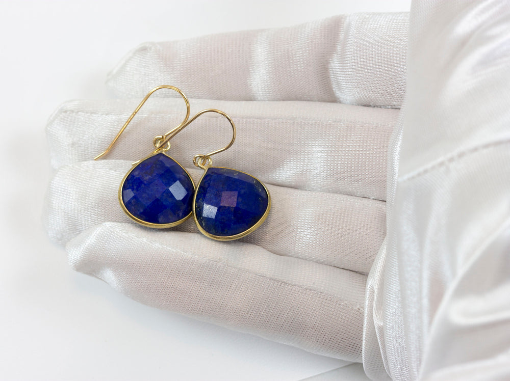 Lapis Lazuli Earrings 14k solid gold or fill Natural Blue Bezel Heart Faceted Teardrop Simple Drops 1.2 Inches Classic Drops Pyrite Flecks