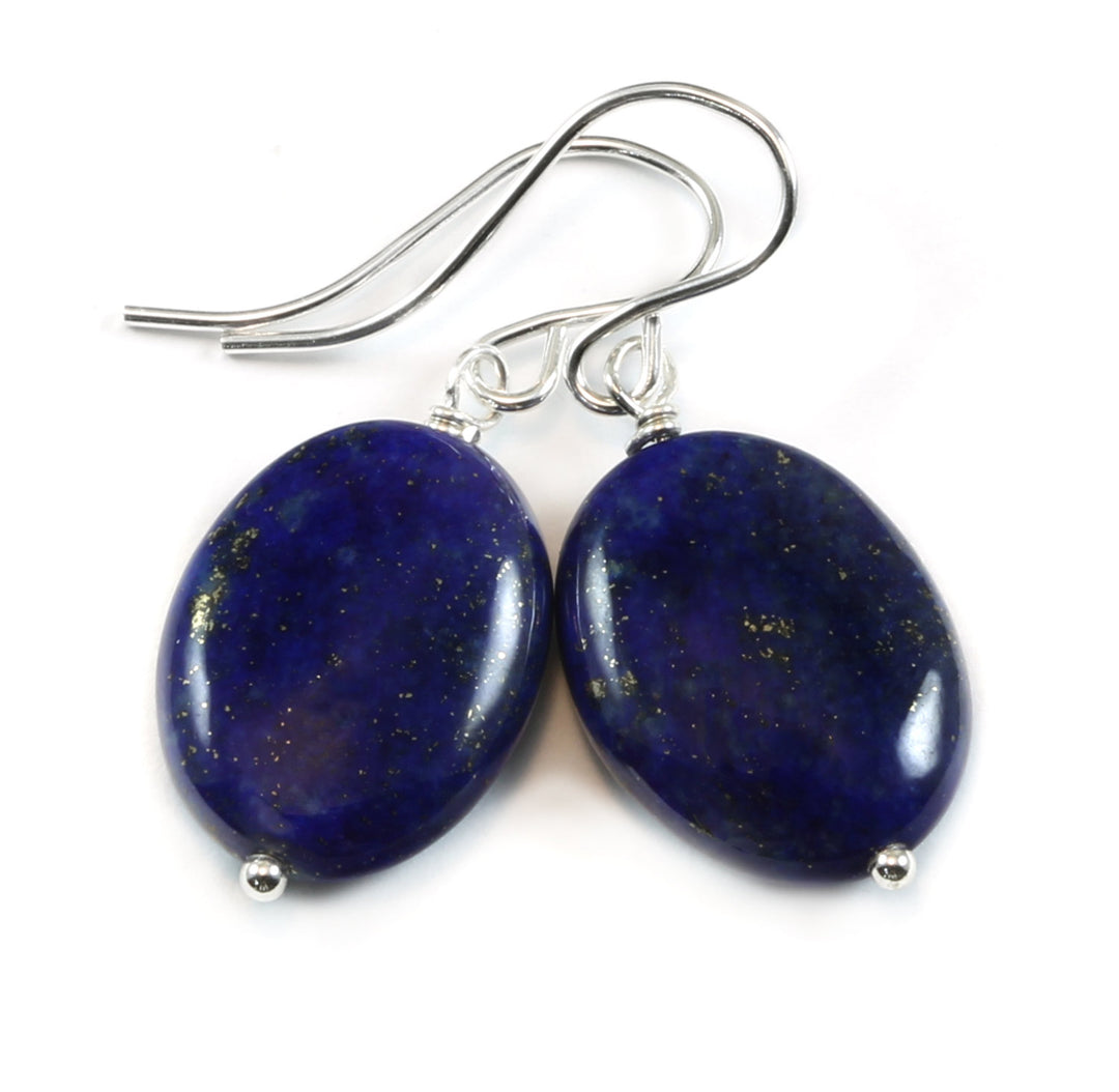 Blue Lapis Lazuli Earrings Natural Large Long Oval Smooth Sterling Silver or 14k Solid Gold or Filled Natural Pyrite Flecks Puffed Drops