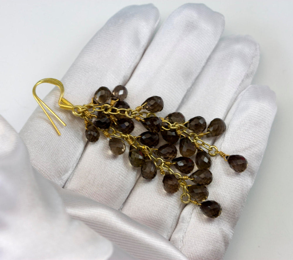 Smoky Quartz Earrings Cluster Style 14k Solid Gold or Filled Micro Faceted Multiple Briolettes Chandelier Natural Smokey Grey 3 Inches