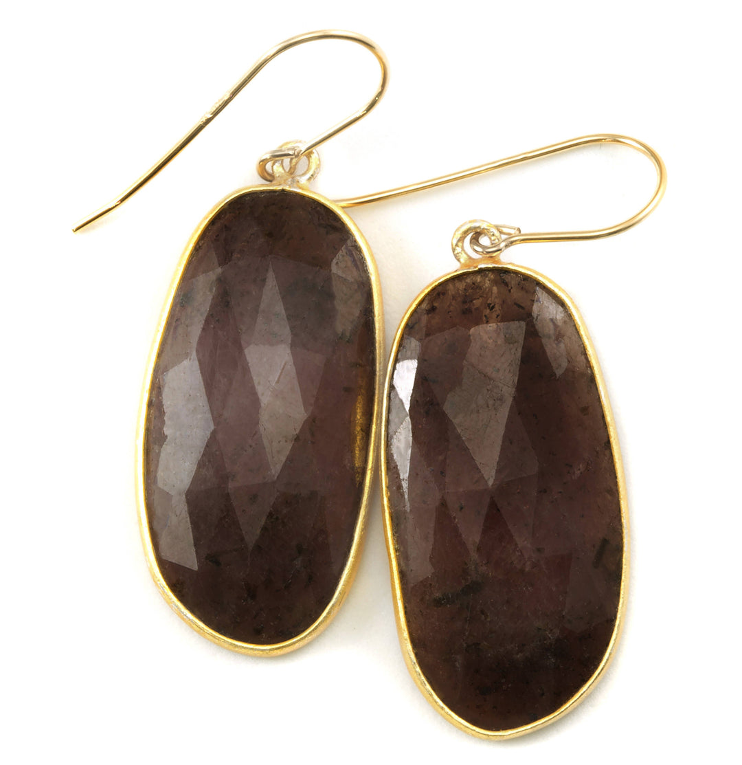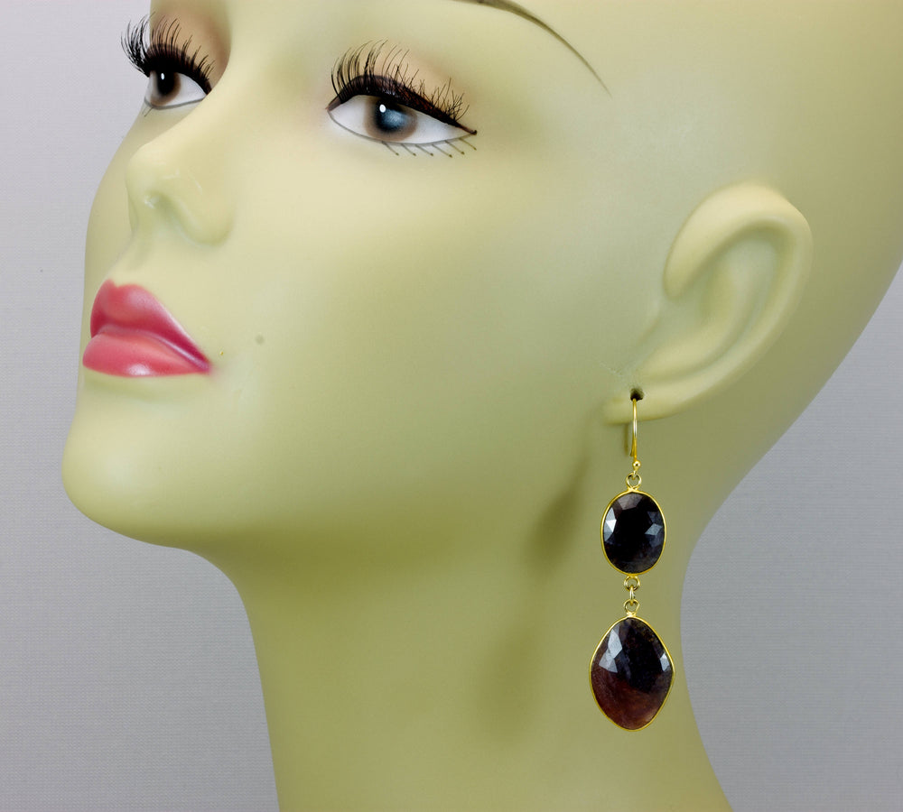 Dark Red Sapphire Earrings Teardrop 14k Gold Filled Bezel Rectangle Shaped Faceted Simple Double Hung Bezeled Long Drops Natural 2.5 Inch