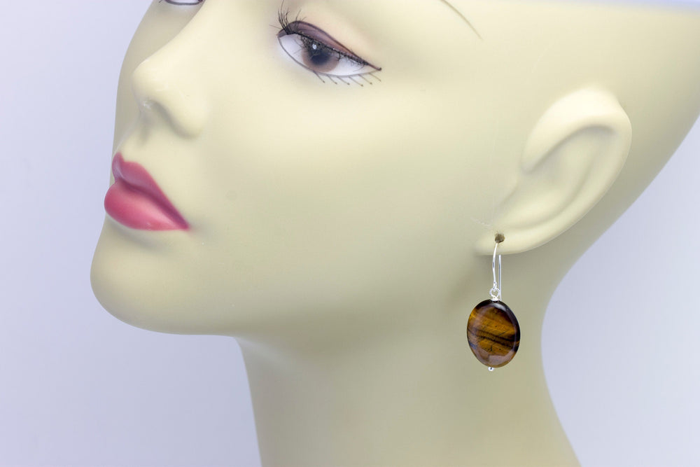 Tiger's Eye Earrings Smooth Large Oval Teardrop Dangle Sterling Silver or 14k Solid Gold or Filled Striped Natural Simple Spyglass Designs