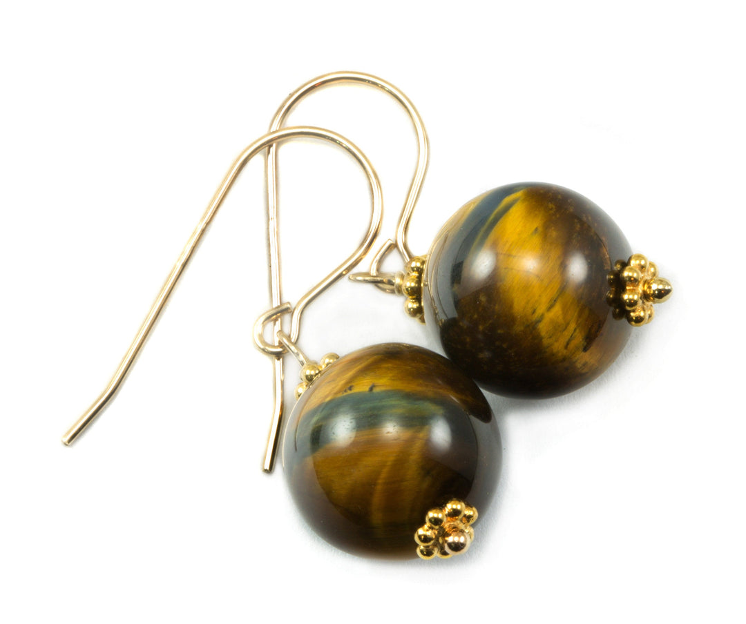 Tiger's Eye Earrings Smooth Round Drops Red or Golden Sterling Silver or 14k Solid Gold or Filled Striped Natural Simple Spyglass Designs