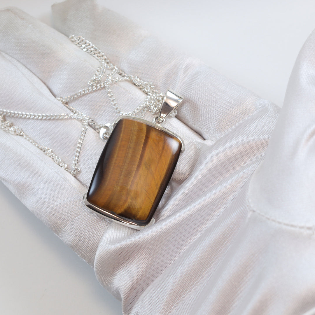 Tiger's Eye Pendant Rectangle Shaped Golden Stripes Sterling Silver Curb Chain 20 Inches Natural Simple Spyglass Designs